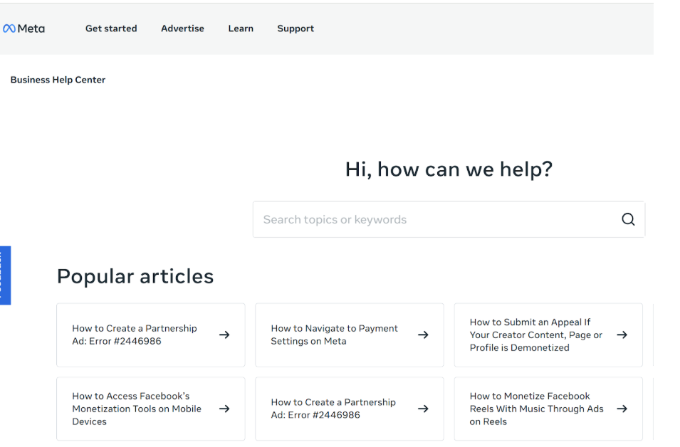 - Use public help articles on the Meta Business Help Center
